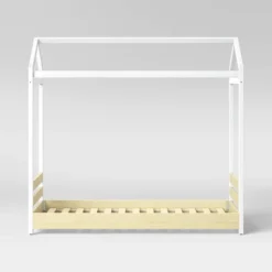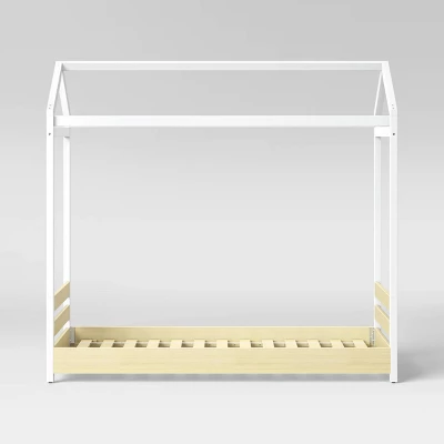 Bring a functional and cute update to your kiddo’s bedroom with this Twin House Bed from Pillowfort™. Featuring a low-floor design for easy climbing or getting down, this kids platform bed features wooden slats that prevent the mattress from sagging and eliminate the need for a box spring. In a white hue with light brown wooden finish, this kids canopy bed adds sweet style to their room. Simply add a comfortable mattress and colorful sheets with fluffy pillows to easily transform their room into a super-cool sleeping retreat.